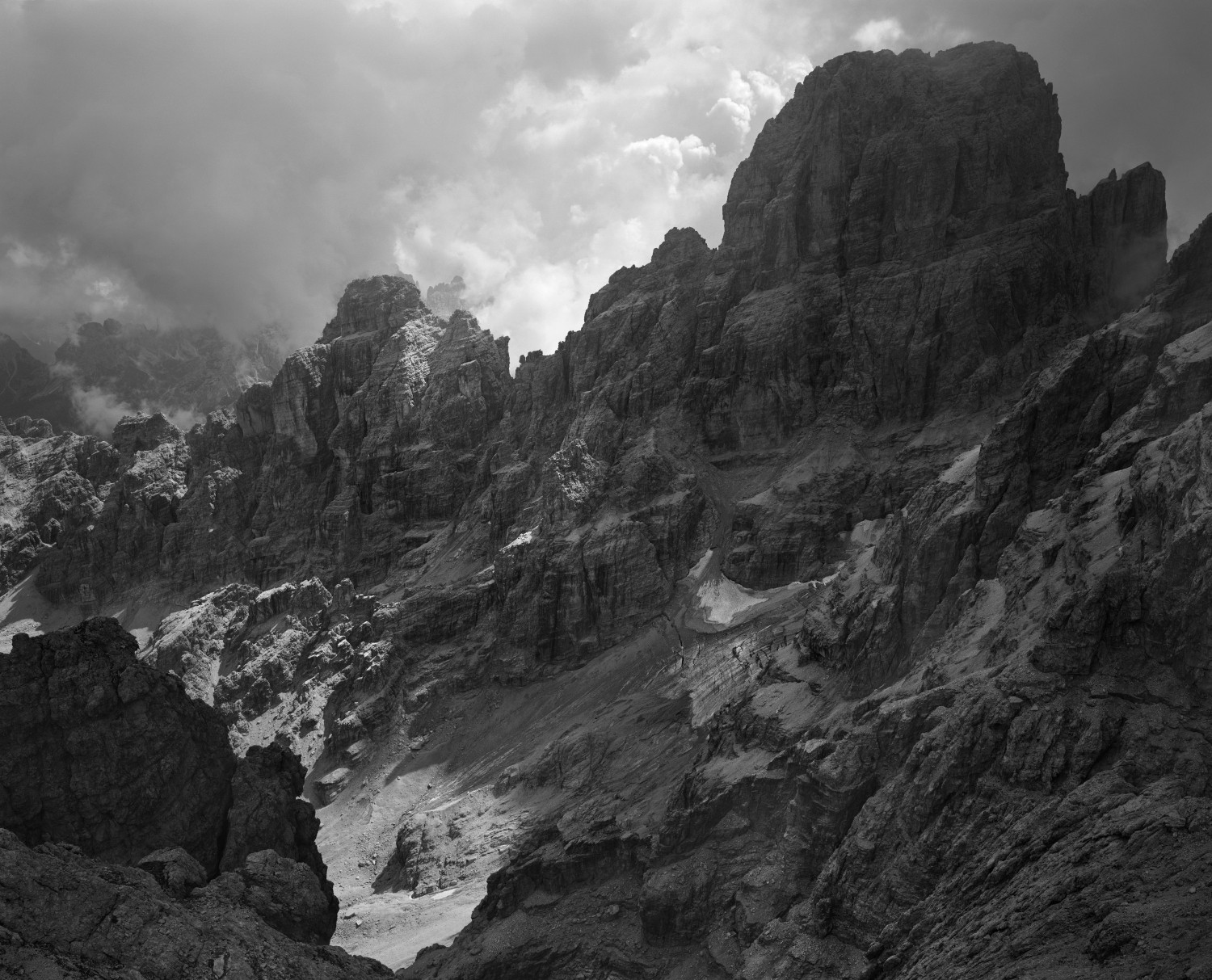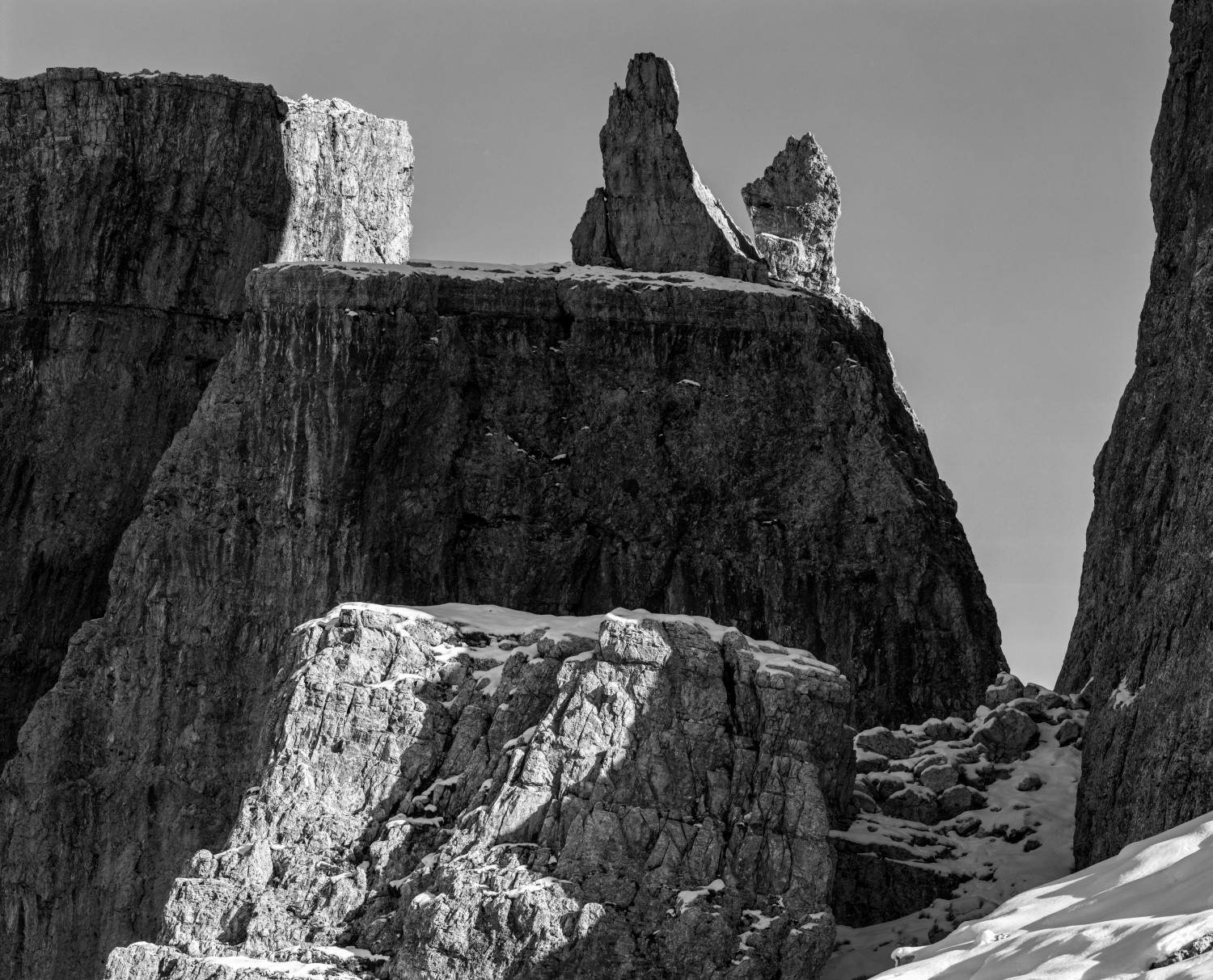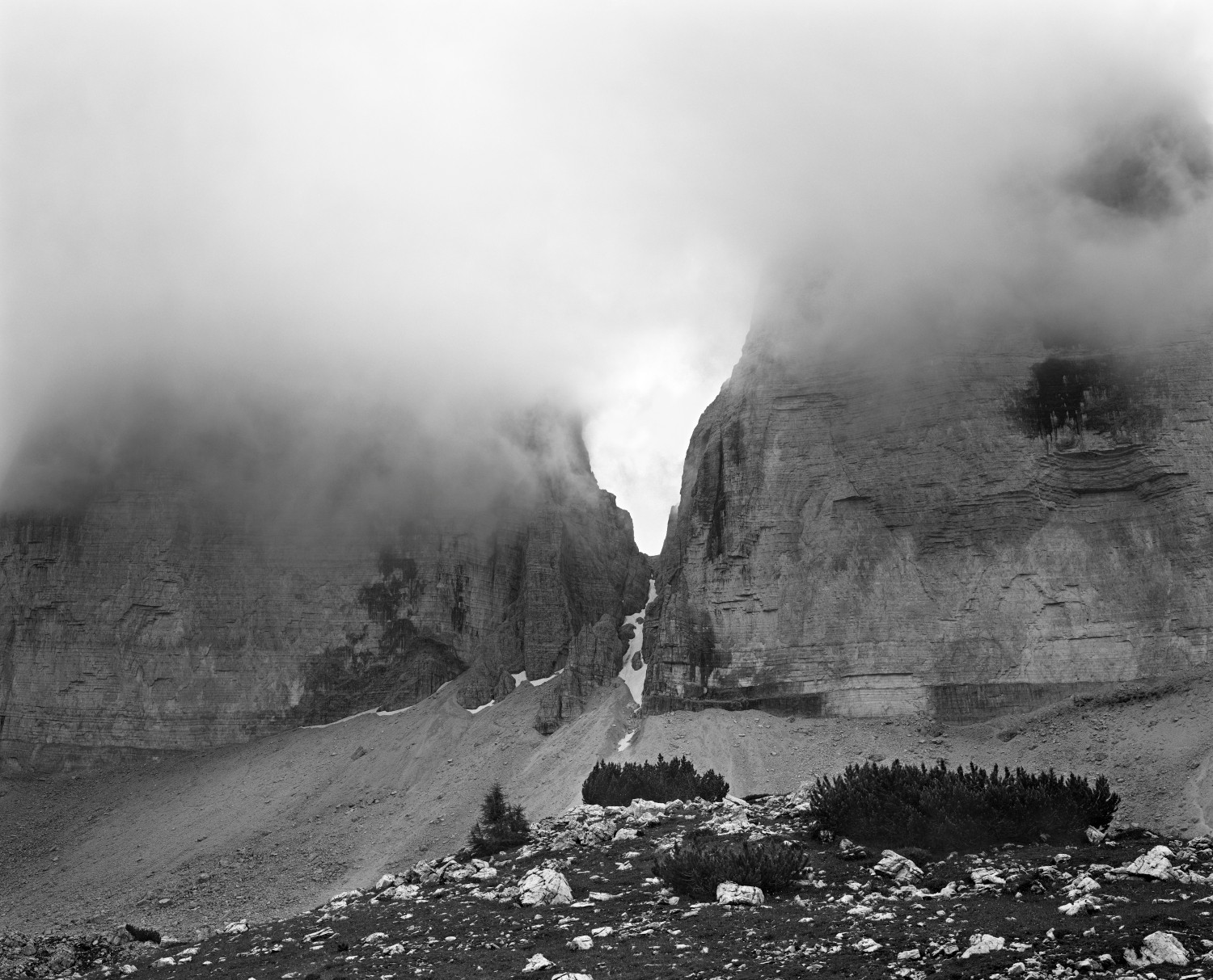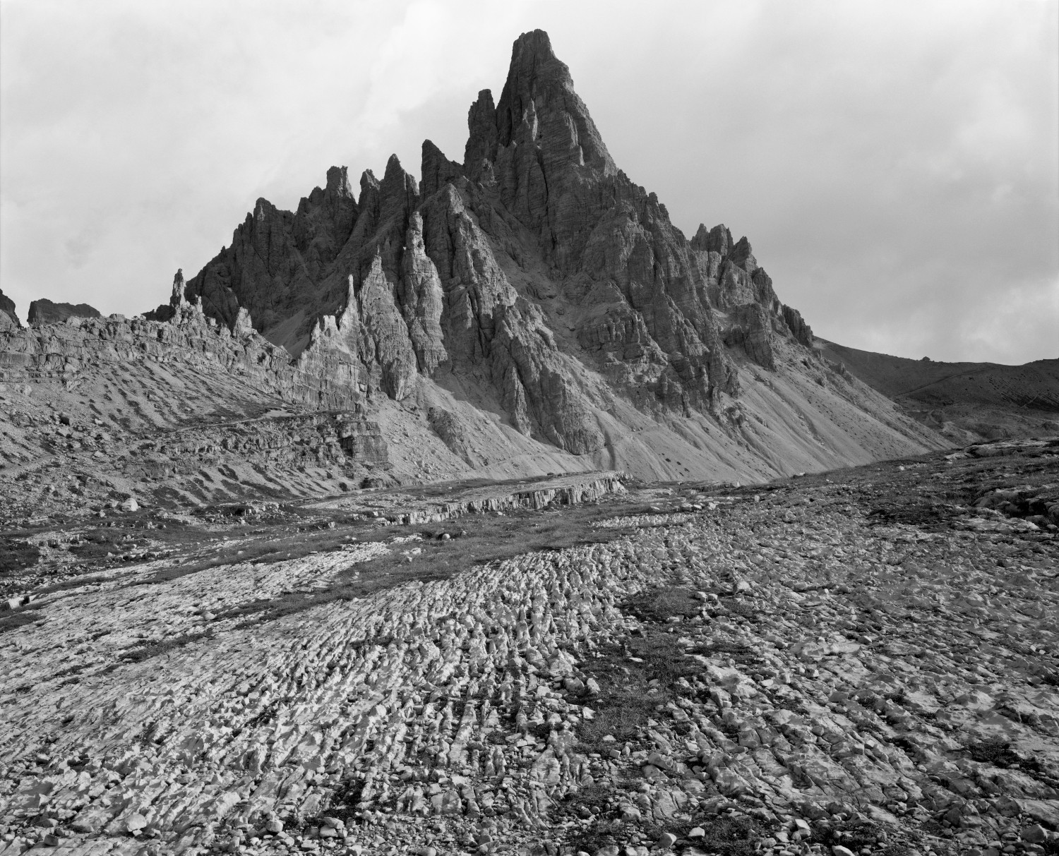 Jens Dietzels Bilder fangen die Stimmung dieser alpinen Region ein, wir betrachten sie fast wie der erste Mensch, der so etwas zu sehen bekommt, so sehr überträgt sich die Stille dieser schroffen Berge. Steile Dolomitwände, Felsnadeln, Scharten, Geröllhalden – alles unwirtlich, wüst, unzugänglich, entzogen – Embleme des Erhabenen.