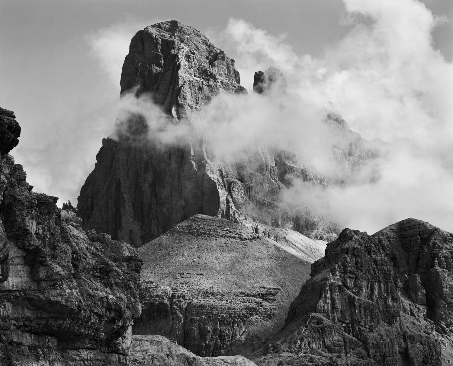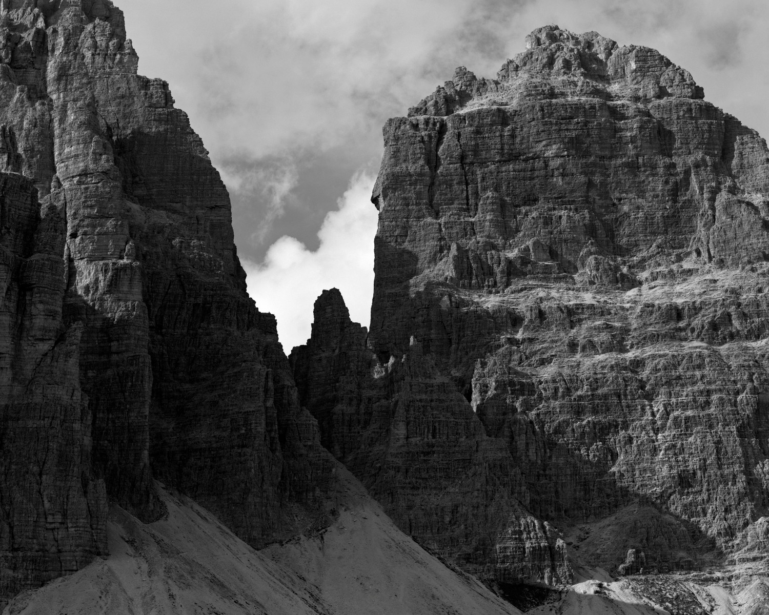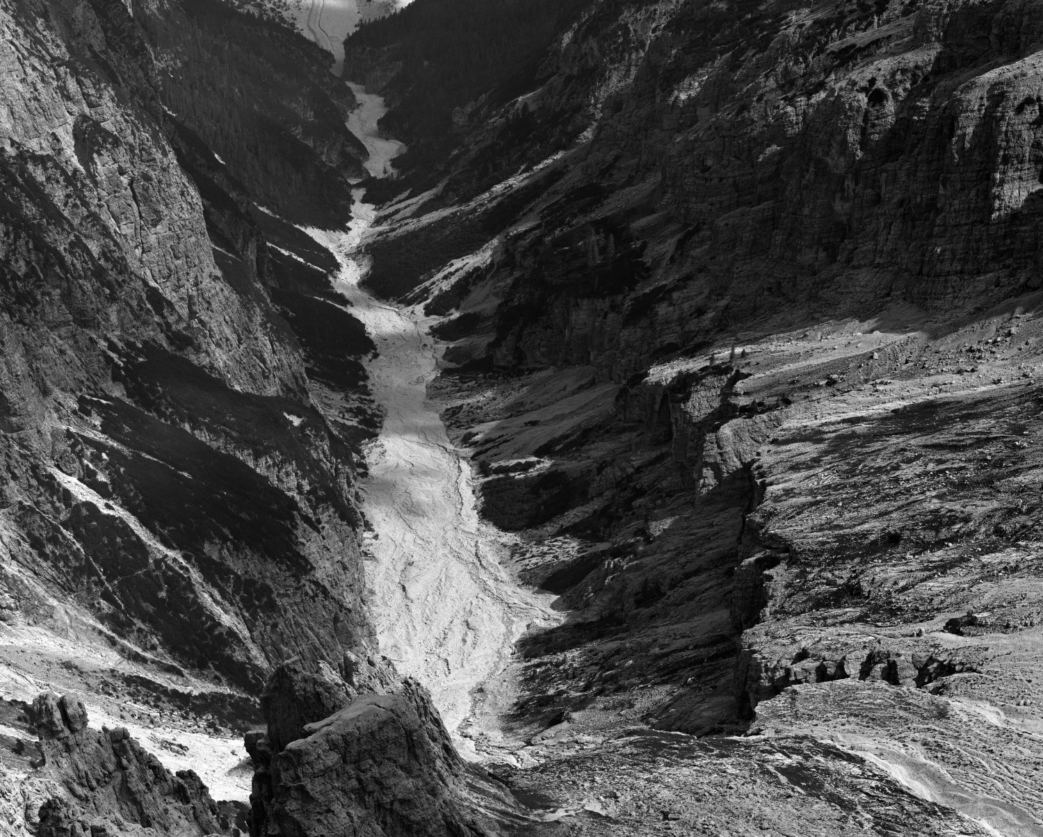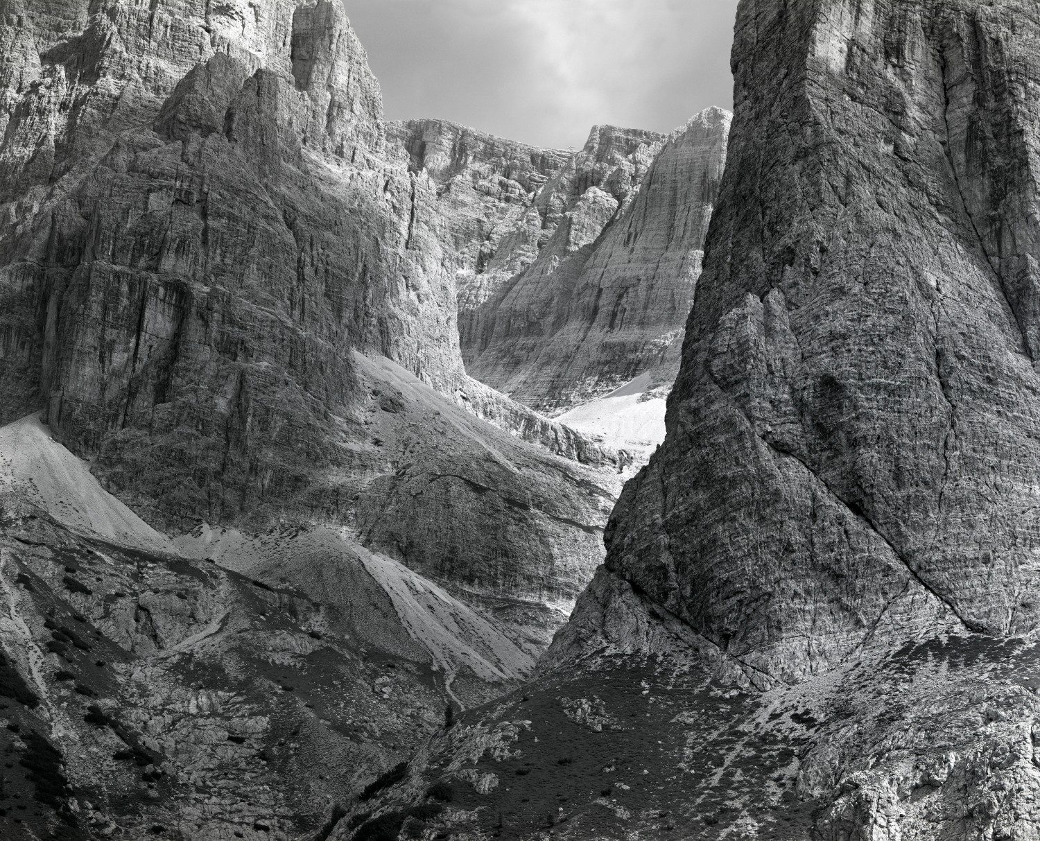 Jens Dietzels Bilder fangen die Stimmung dieser alpinen Region ein, wir betrachten sie fast wie der erste Mensch, der so etwas zu sehen bekommt, so sehr überträgt sich die Stille dieser schroffen Berge. Steile Dolomitwände, Felsnadeln, Scharten, Geröllhalden – alles unwirtlich, wüst, unzugänglich, entzogen – Embleme des Erhabenen.
