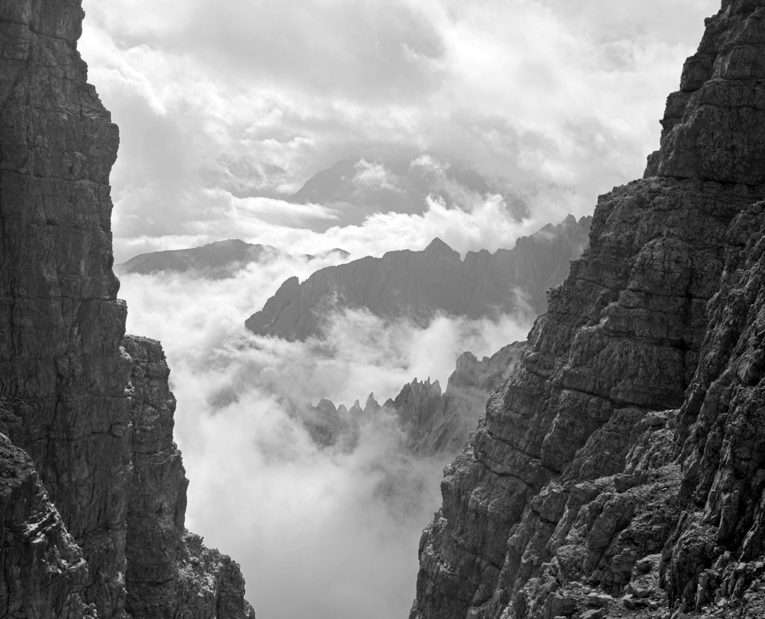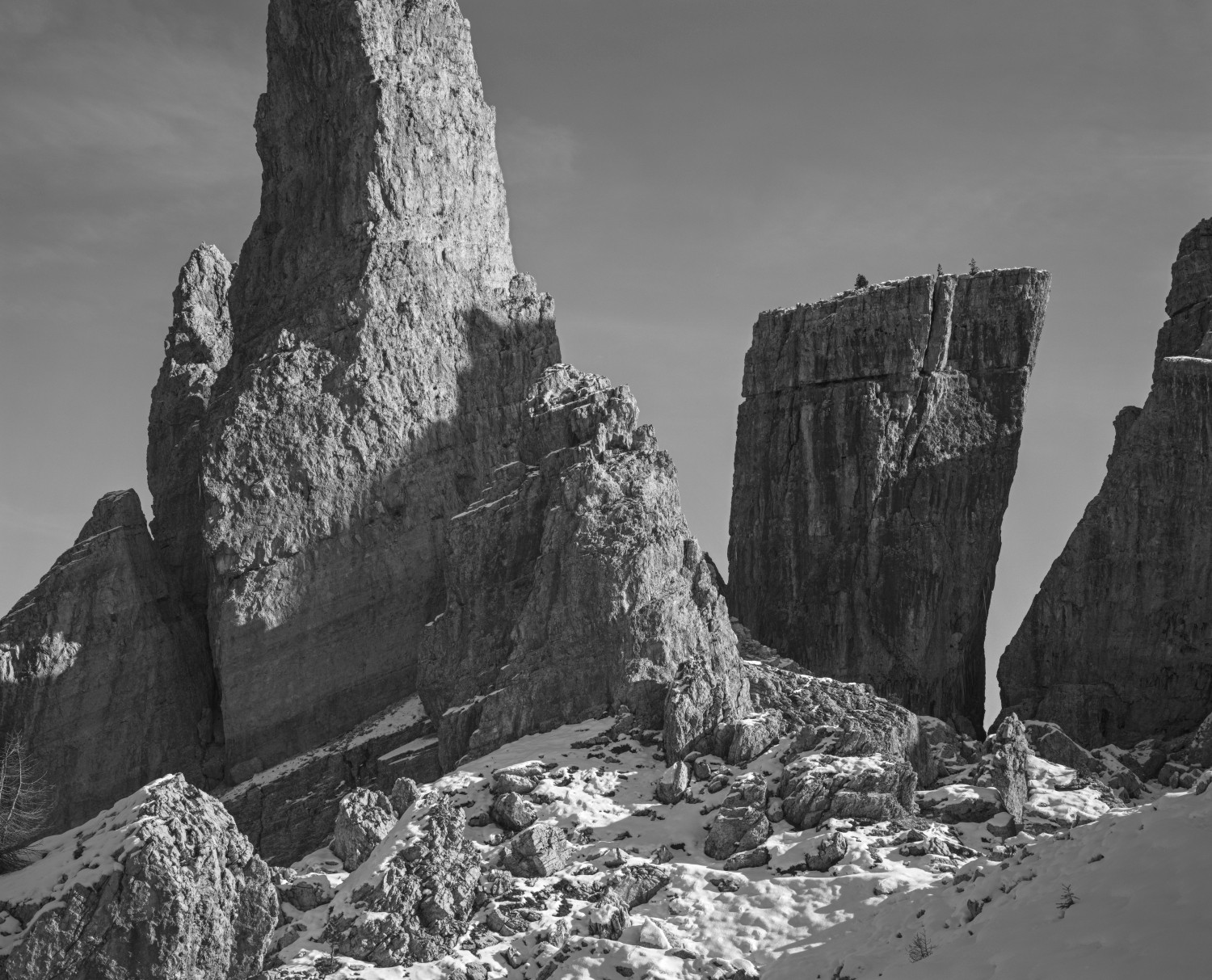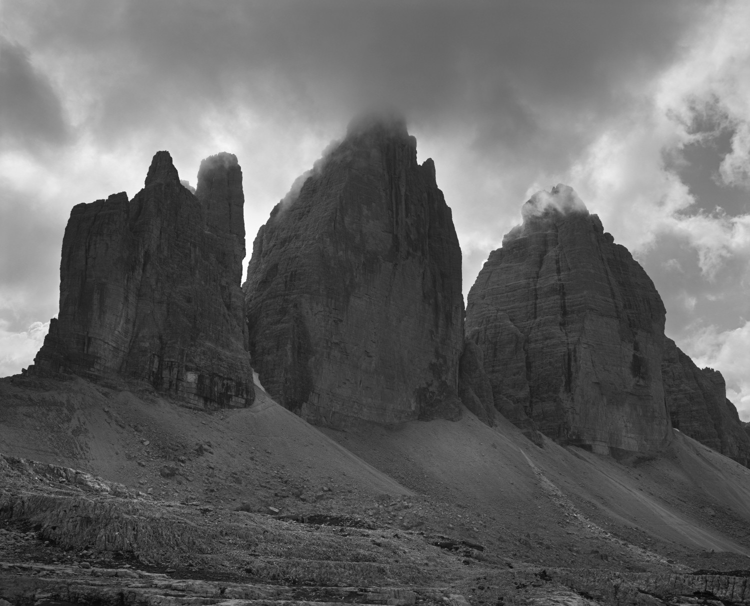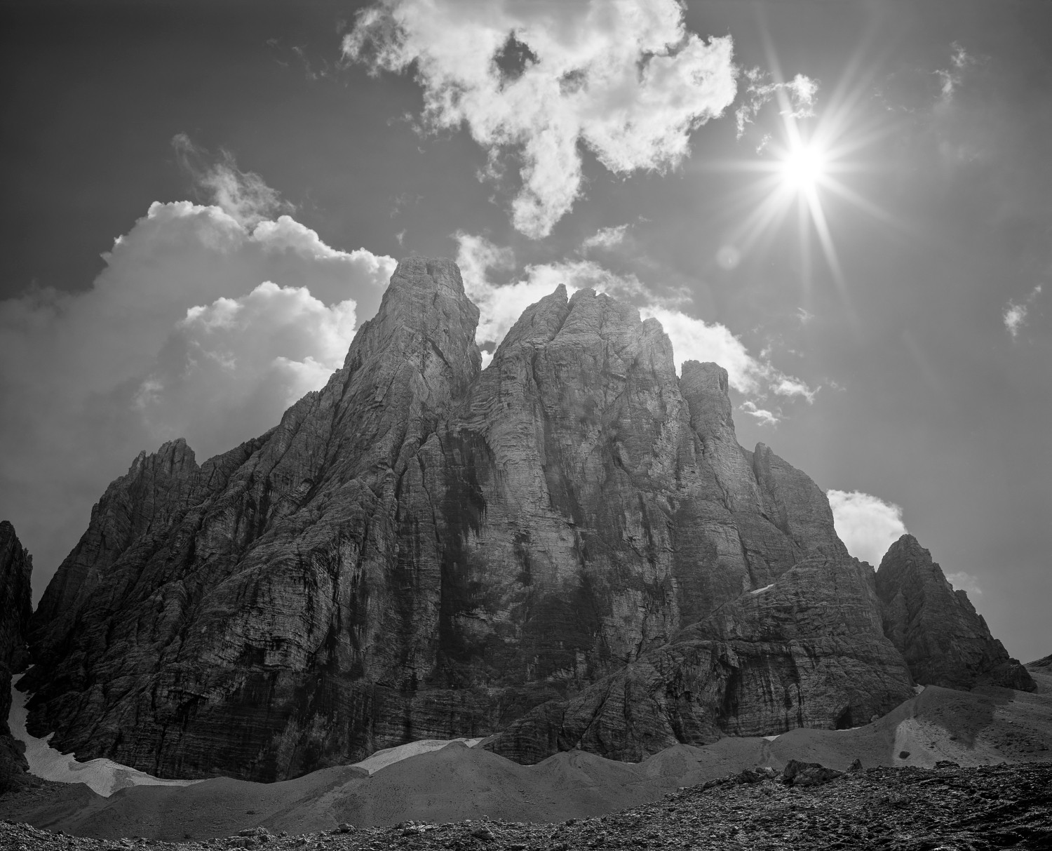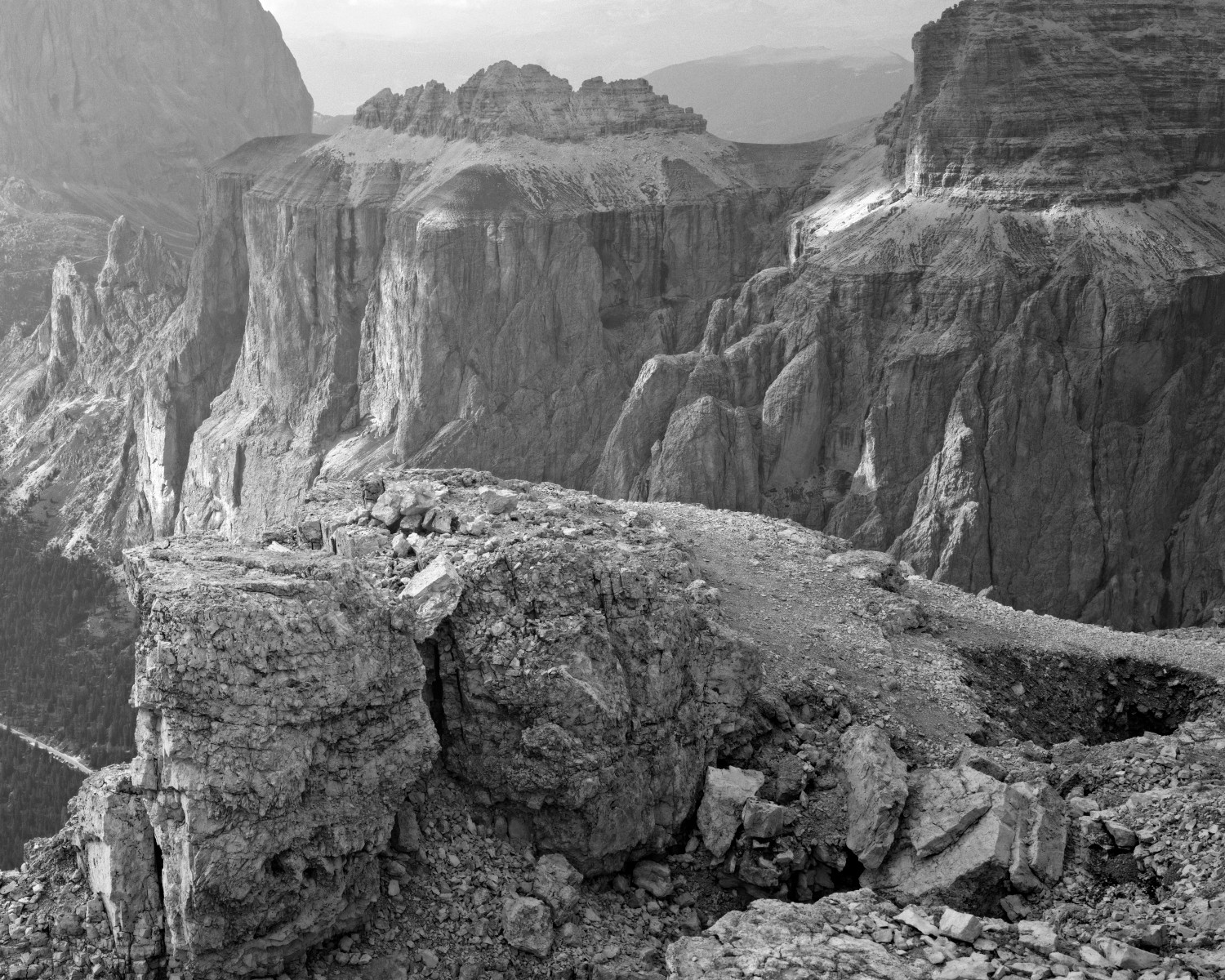 Jens Dietzels Bilder fangen die Stimmung dieser alpinen Region ein, wir betrachten sie fast wie der erste Mensch, der so etwas zu sehen bekommt, so sehr überträgt sich die Stille dieser schroffen Berge. Steile Dolomitwände, Felsnadeln, Scharten, Geröllhalden – alles unwirtlich, wüst, unzugänglich, entzogen – Embleme des Erhabenen.