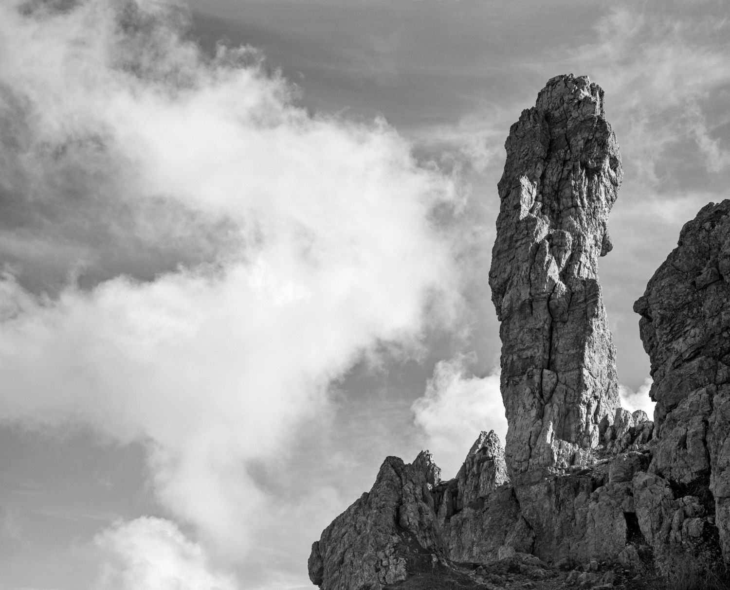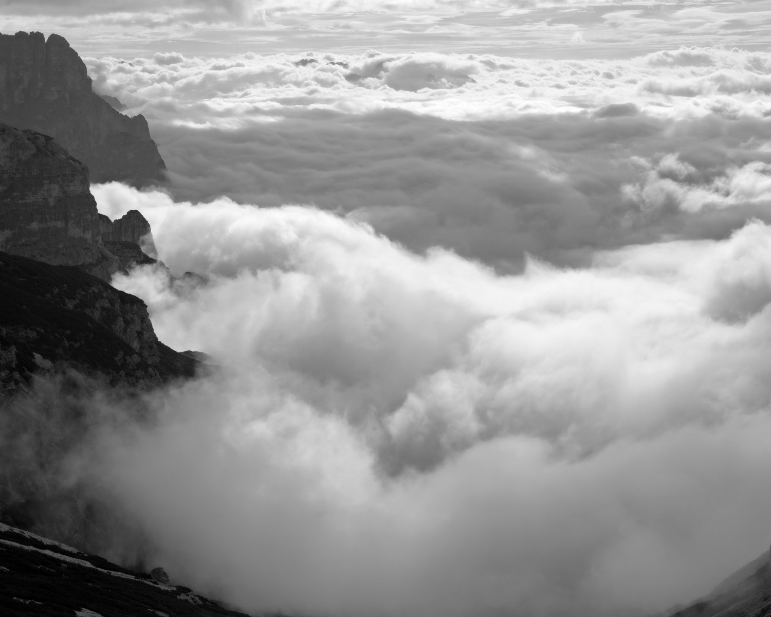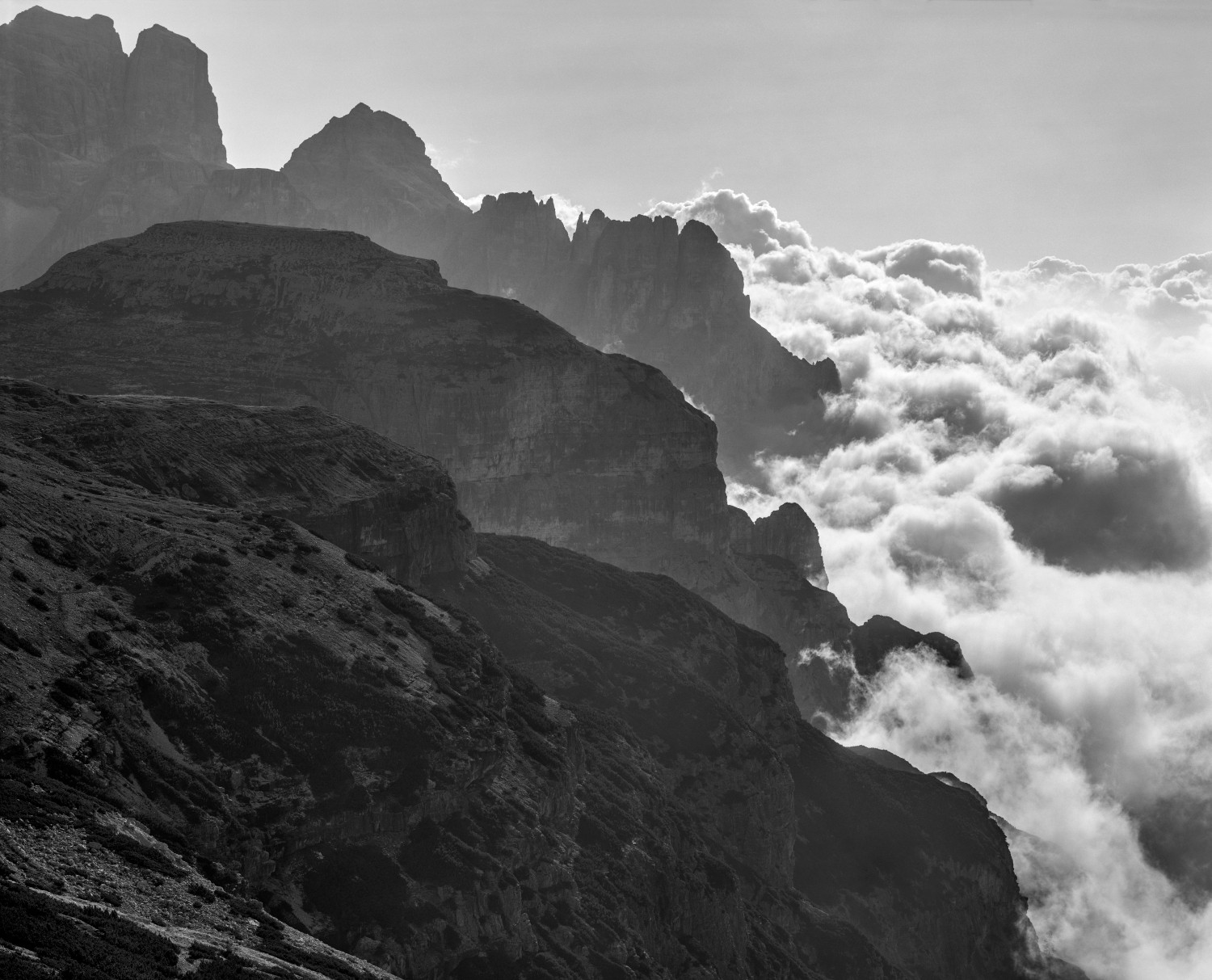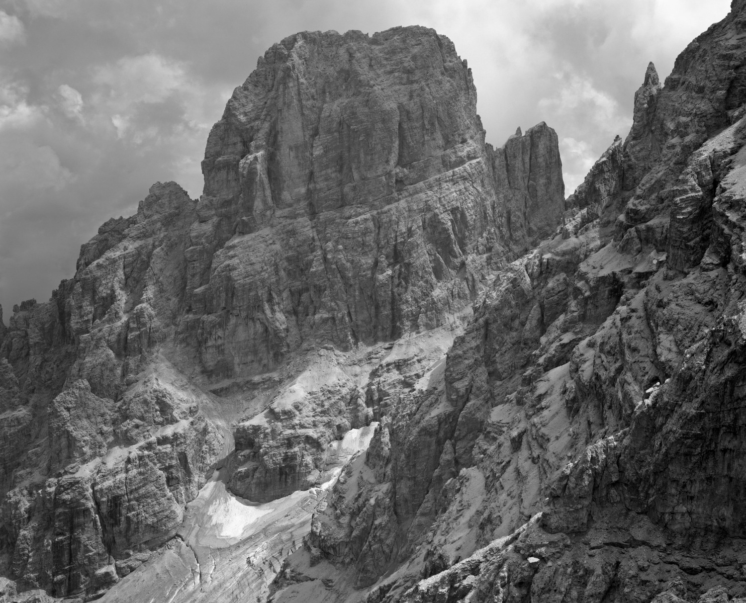 Jens Dietzels Bilder fangen die Stimmung dieser alpinen Region ein, wir betrachten sie fast wie der erste Mensch, der so etwas zu sehen bekommt, so sehr überträgt sich die Stille dieser schroffen Berge. Steile Dolomitwände, Felsnadeln, Scharten, Geröllhalden – alles unwirtlich, wüst, unzugänglich, entzogen – Embleme des Erhabenen.