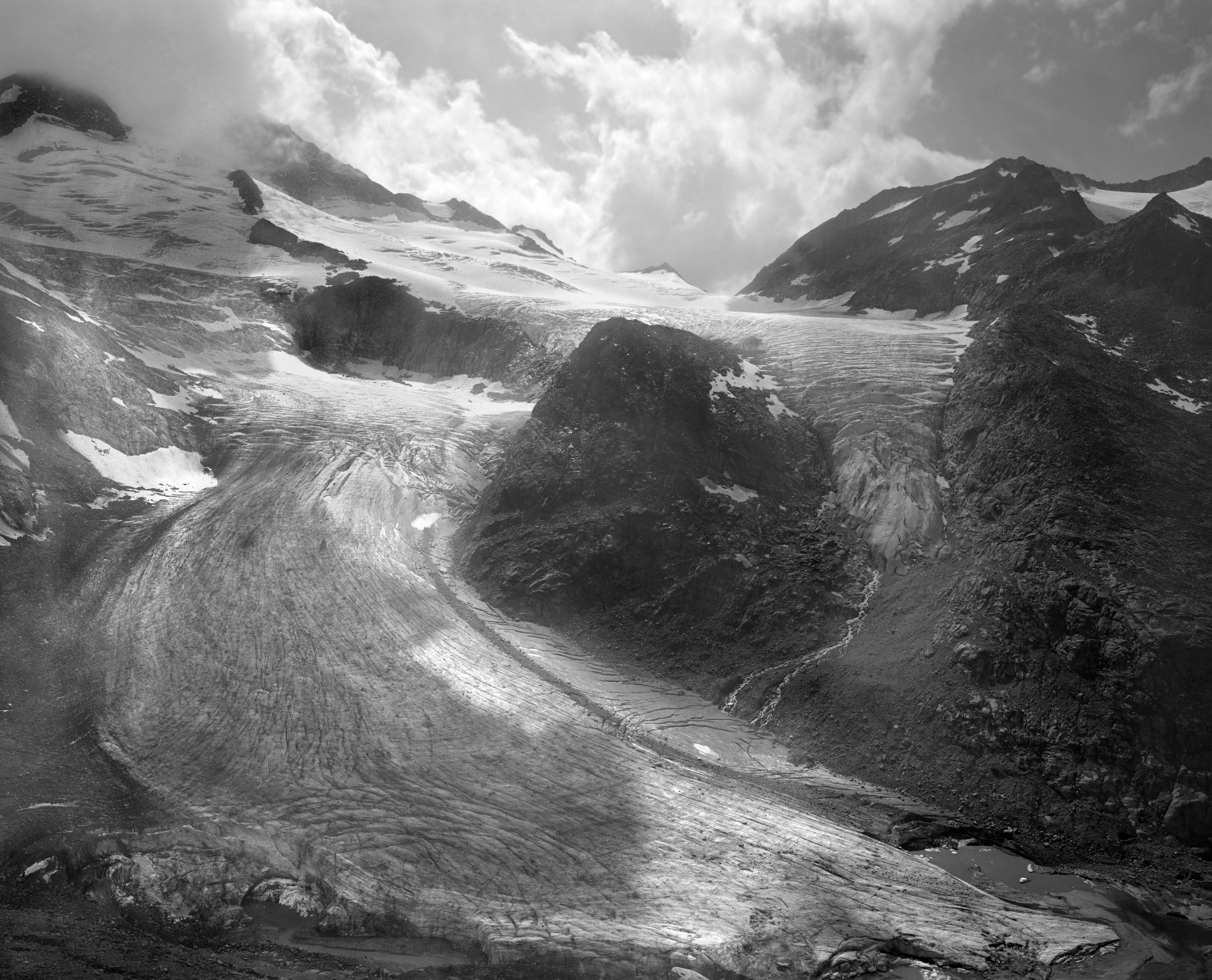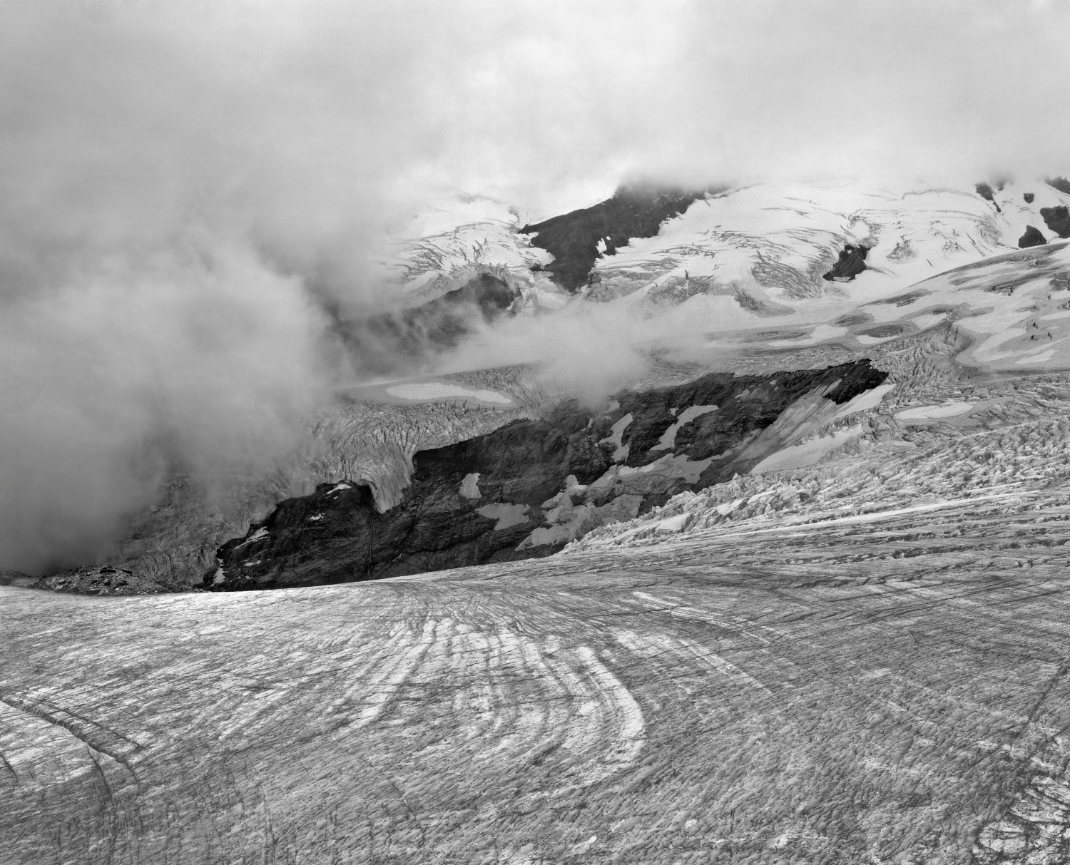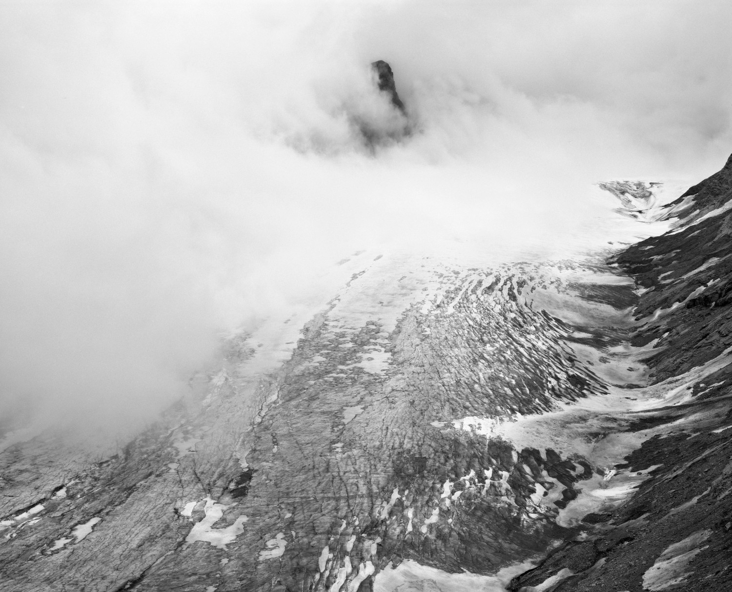 Ein Wolkenbild: rechts fließt Geröll rhythmisiert durch Schneeflächen herein, diese leiten über zum Glanzfluss einer Gletscheroberfläche, deren Helle wiederum und Zartheit feiner Linien sich in die Wolke auflösen, die oberhalb der Diagonale den Bildraum gestaltet. Ein Gipfelfragment ragt jäh aus einem Guckloch, konzentrierte schwarze Antwort auf den seitlichen dunklen Einfluss. Schauspiele: Linienspiele, Luft versus Masse, Mitte versus Raum, Fläche versus Linie – eine schier unerschöpfliche Kombinatorik.