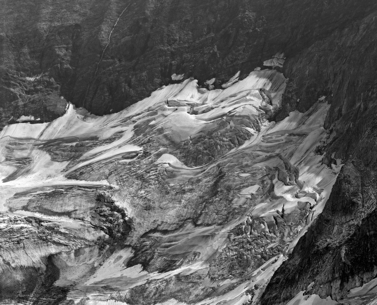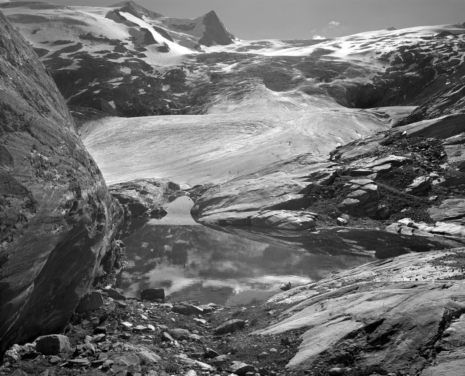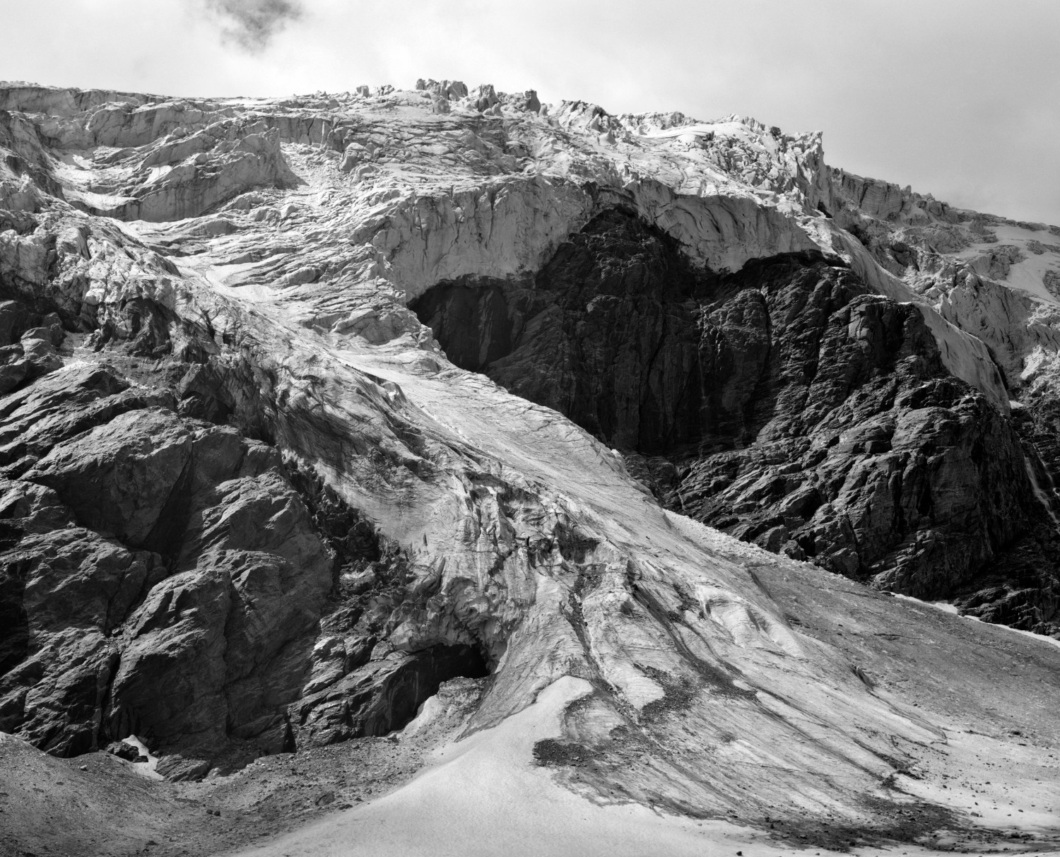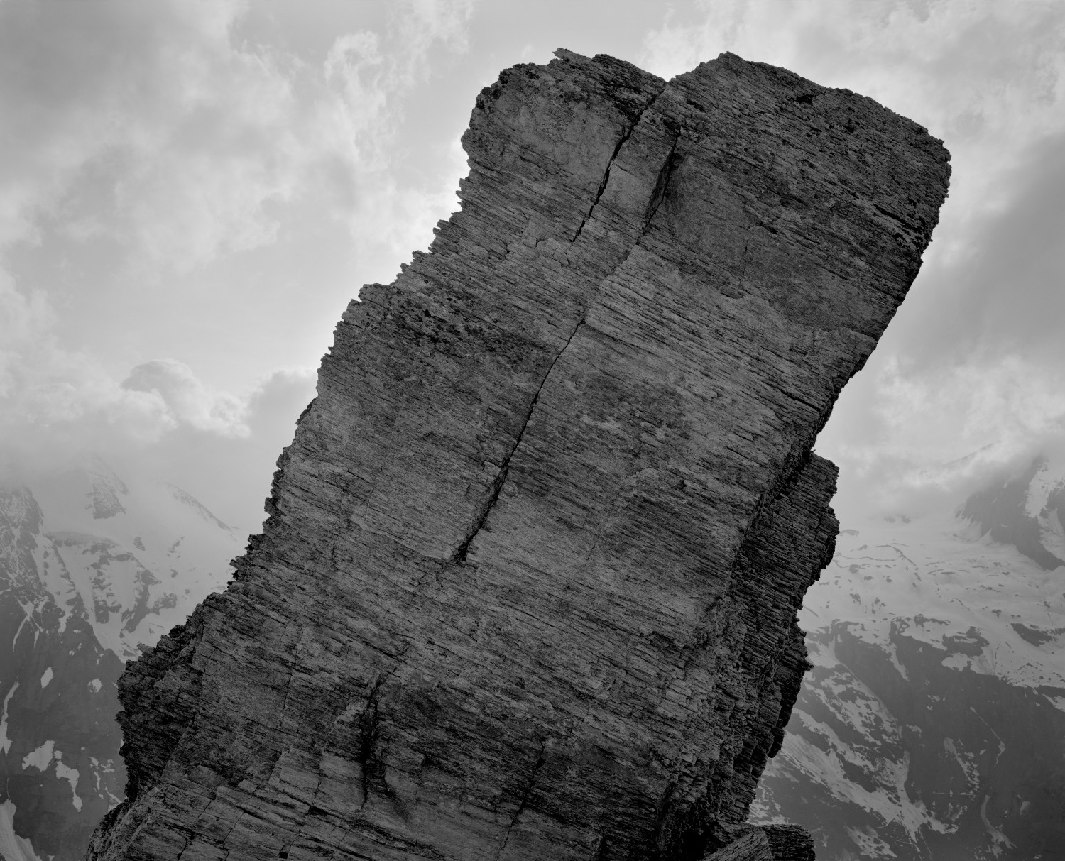 Ein Wolkenbild: rechts fließt Geröll rhythmisiert durch Schneeflächen herein, diese leiten über zum Glanzfluss einer Gletscheroberfläche, deren Helle wiederum und Zartheit feiner Linien sich in die Wolke auflösen, die oberhalb der Diagonale den Bildraum gestaltet. Ein Gipfelfragment ragt jäh aus einem Guckloch, konzentrierte schwarze Antwort auf den seitlichen dunklen Einfluss. Schauspiele: Linienspiele, Luft versus Masse, Mitte versus Raum, Fläche versus Linie – eine schier unerschöpfliche Kombinatorik.