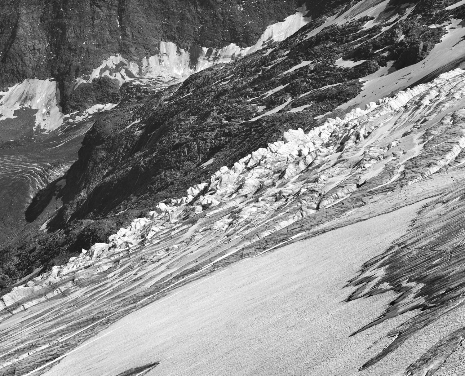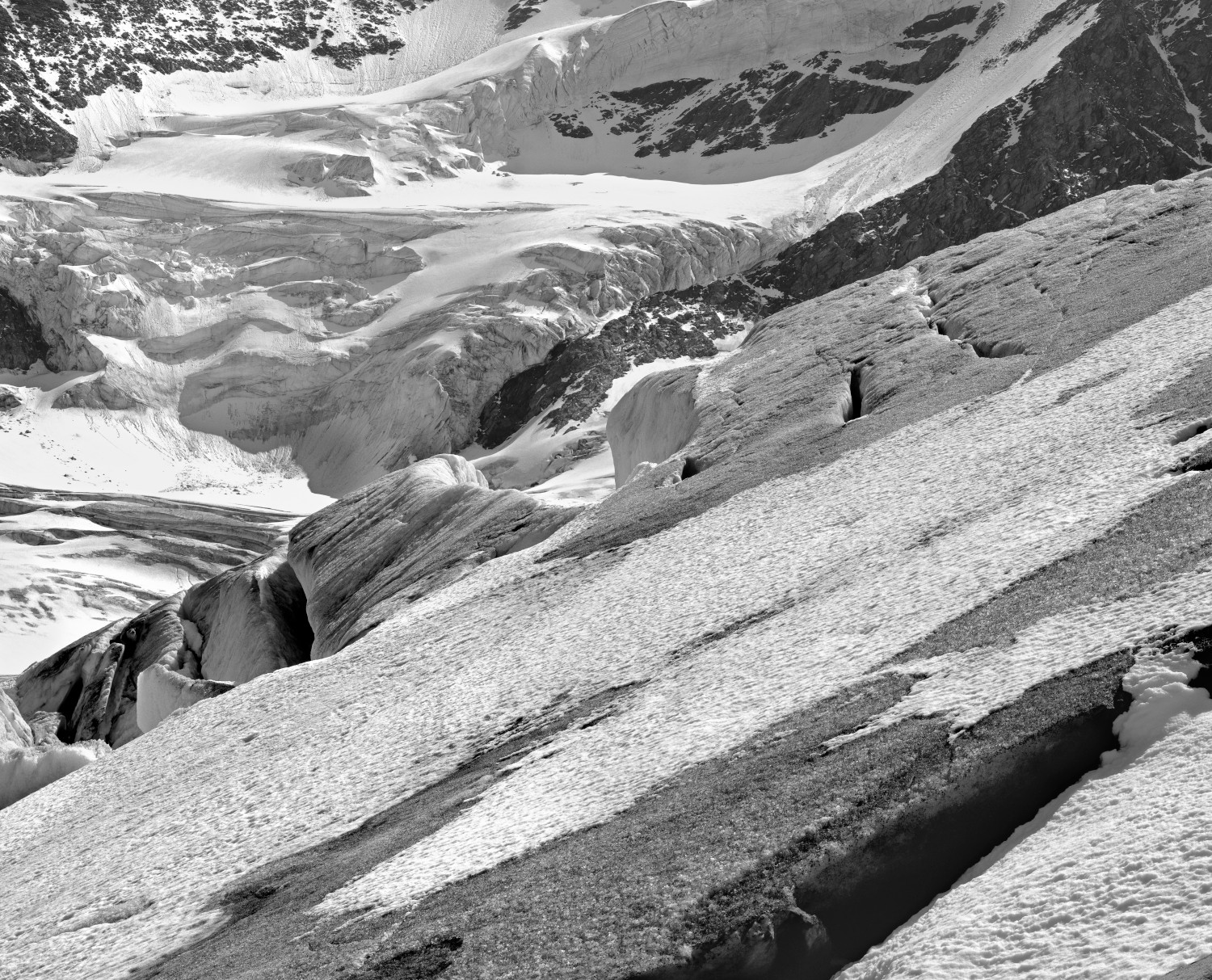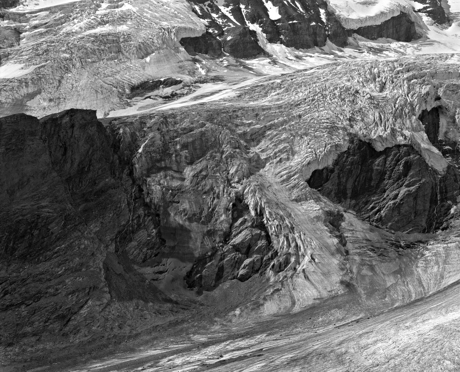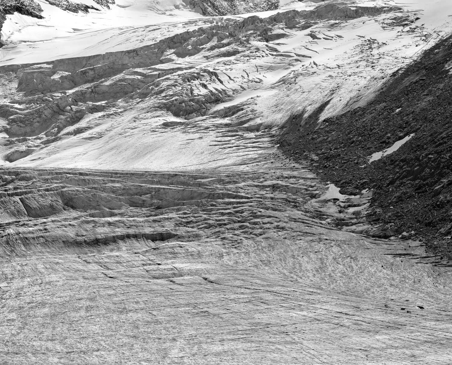 Ein natürliches Element wird ein Sujet für den Betrachter. Dabei zeigt sich das Gespür des Fotografen für eine in der Natur angelegte Formensprache, die er durch seine Aufnahmetechnik zum Gestaltungselement herausbildet. Kontraste sind dabei ein durchgängiges Stilmittel. Ein Beispiel: in der Dynamik paralleler Schrägen verzahnen sich quer zu den Hauptlinien steinige bröckelige Dunkelblöcke mit eisfaltenschraffierten hellen Partien im Mittelteil des Bildes. Darüber, versetzt, Eispartien herabtreppend, dunkle seitliche Steinwellen. Eine Komposition aus einer versetzten Hell-Dunkel-Verzahnung von Eis- und Steintexturen. Der Betrachter kann nun selbst auf Entdeckungsreise gehen.