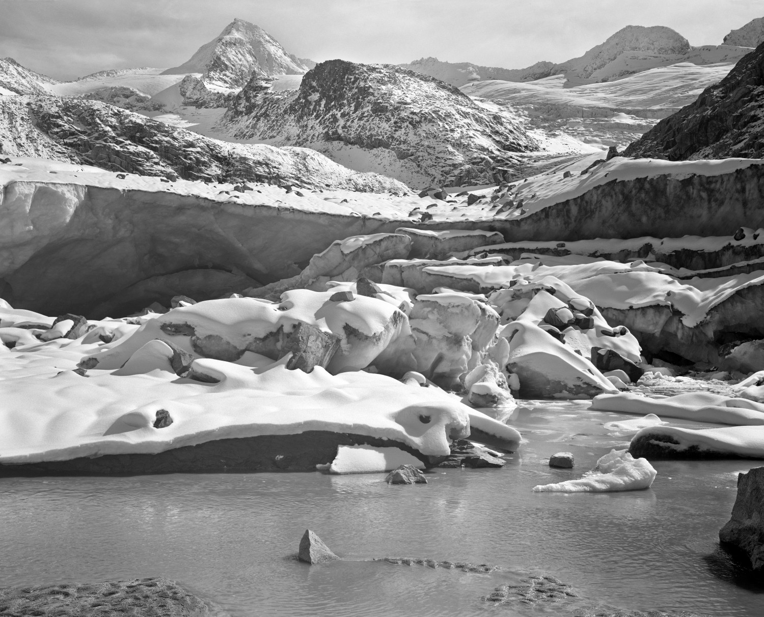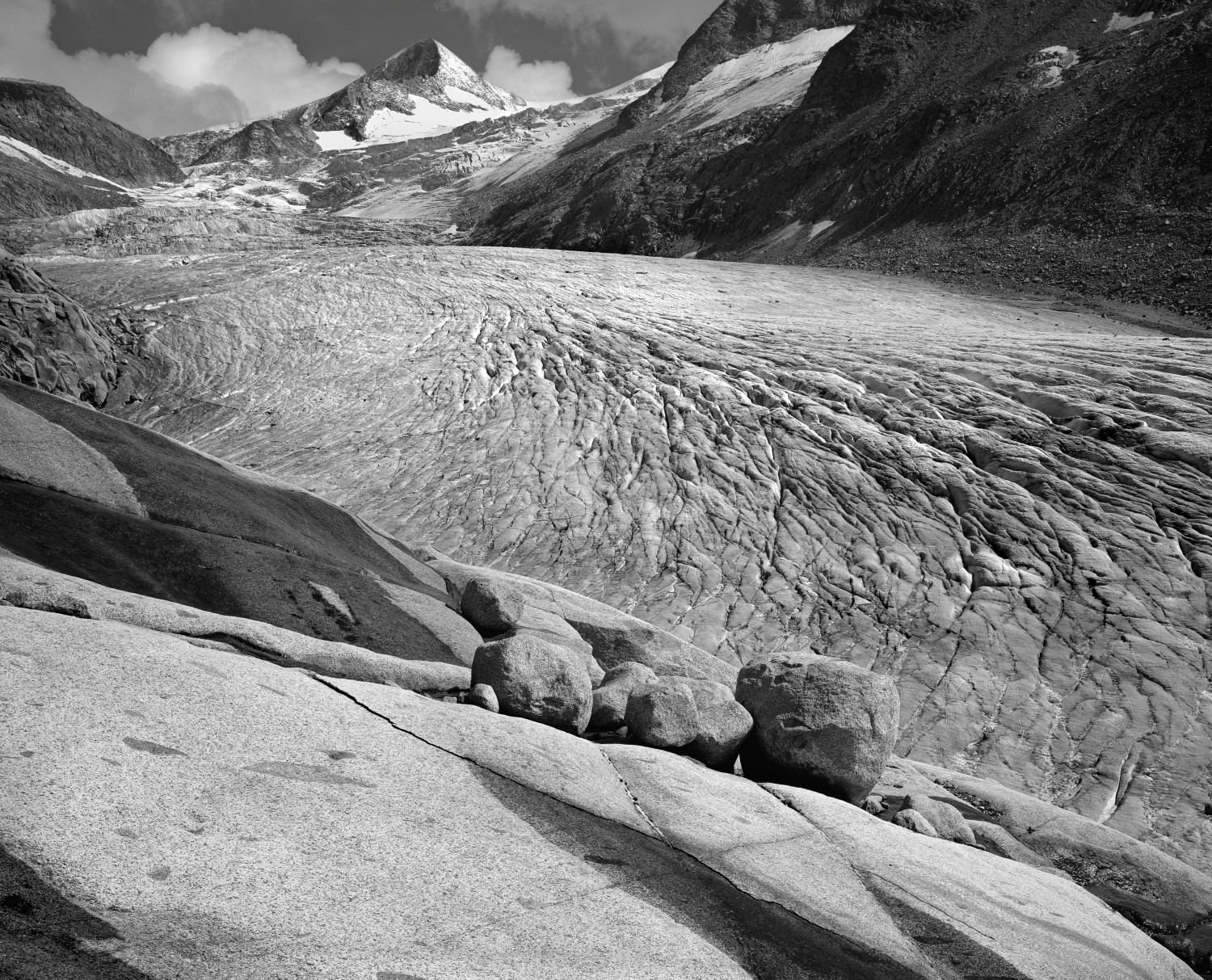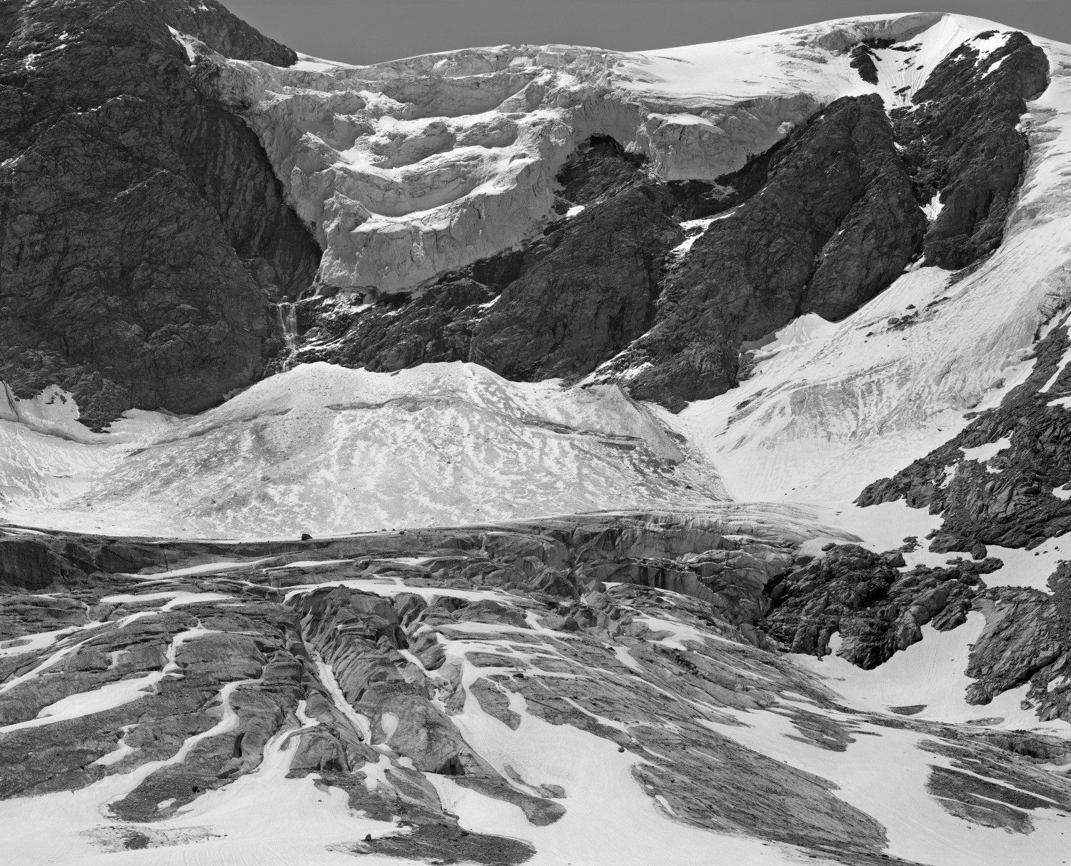 Ein natürliches Element wird ein Sujet für den Betrachter. Dabei zeigt sich das Gespür des Fotografen für eine in der Natur angelegte Formensprache, die er durch seine Aufnahmetechnik zum Gestaltungselement herausbildet. Kontraste sind dabei ein durchgängiges Stilmittel. Ein Beispiel: in der Dynamik paralleler Schrägen verzahnen sich quer zu den Hauptlinien steinige bröckelige Dunkelblöcke mit eisfaltenschraffierten hellen Partien im Mittelteil des Bildes. Darüber, versetzt, Eispartien herabtreppend, dunkle seitliche Steinwellen. Eine Komposition aus einer versetzten Hell-Dunkel-Verzahnung von Eis- und Steintexturen. Der Betrachter kann nun selbst auf Entdeckungsreise gehen.