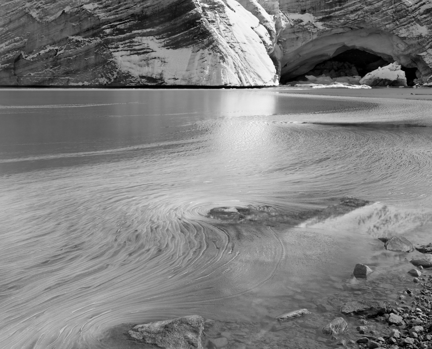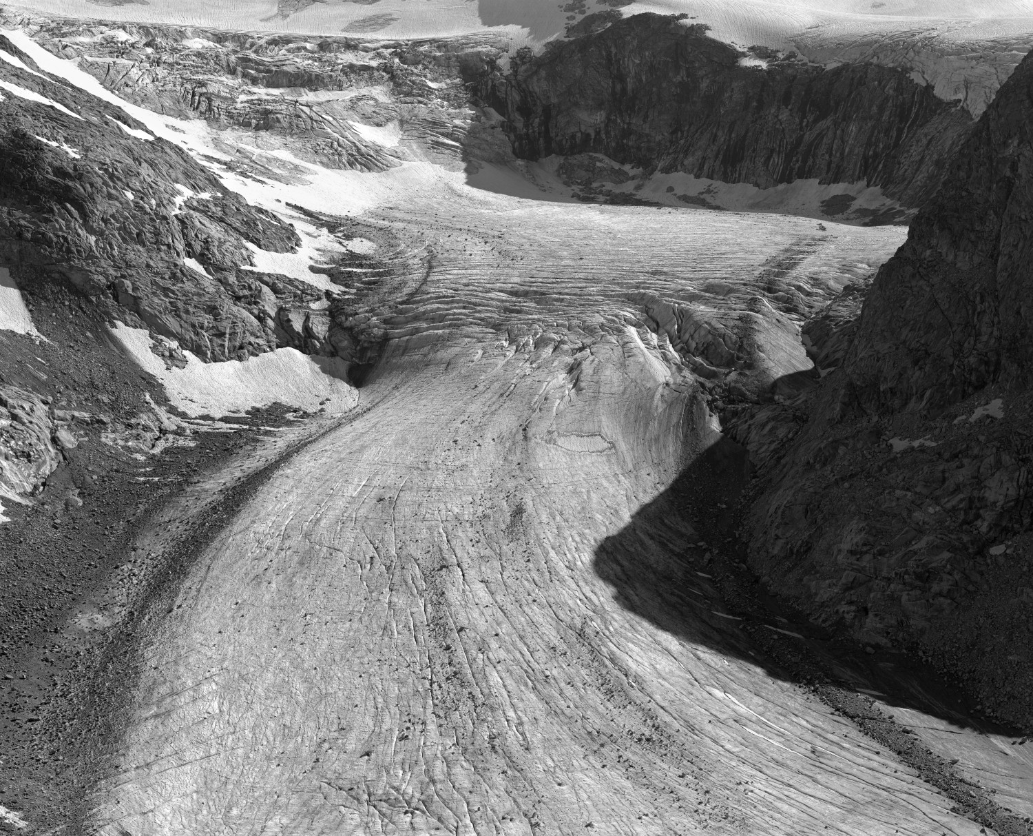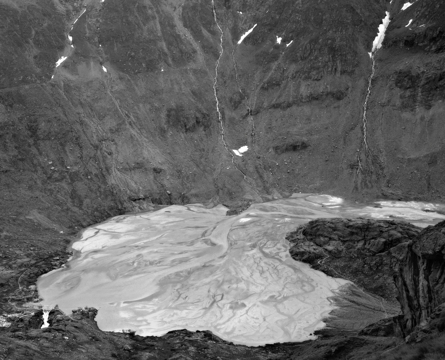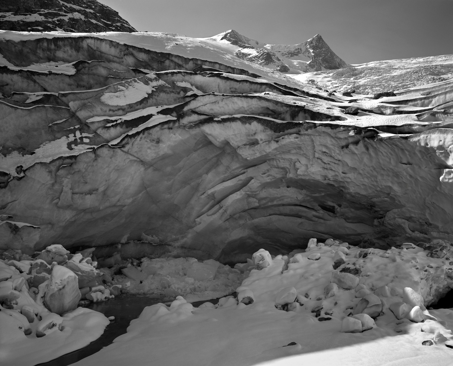 Ein natürliches Element wird ein Sujet für den Betrachter. Dabei zeigt sich das Gespür des Fotografen für eine in der Natur angelegte Formensprache, die er durch seine Aufnahmetechnik zum Gestaltungselement herausbildet. Kontraste sind dabei ein durchgängiges Stilmittel. Ein Beispiel: in der Dynamik paralleler Schrägen verzahnen sich quer zu den Hauptlinien steinige bröckelige Dunkelblöcke mit eisfaltenschraffierten hellen Partien im Mittelteil des Bildes. Darüber, versetzt, Eispartien herabtreppend, dunkle seitliche Steinwellen. Eine Komposition aus einer versetzten Hell-Dunkel-Verzahnung von Eis- und Steintexturen. Der Betrachter kann nun selbst auf Entdeckungsreise gehen.