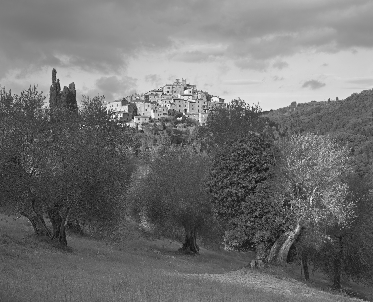 Neben Bäumen gibt es in dieser Bildreihe erstmals architektonische Elemente, den Häuserverbund der Dörfer und kleinen Städte. Mit seinem gebauten Lebensraum ist der Mensch indirekt vertreten, als „Maß aller Dinge“. Über den feinen Blattmustern verschiedener Bäume im Mittelgrund leuchten hell und sehr leicht Häuserwürfel, fenstergemustert, dunkel aufziehende Bewölkung rahmt – unwillkürlich entsteht im Bild die Stimmung eines leichten, aber nie leichtfertigen Lebens.